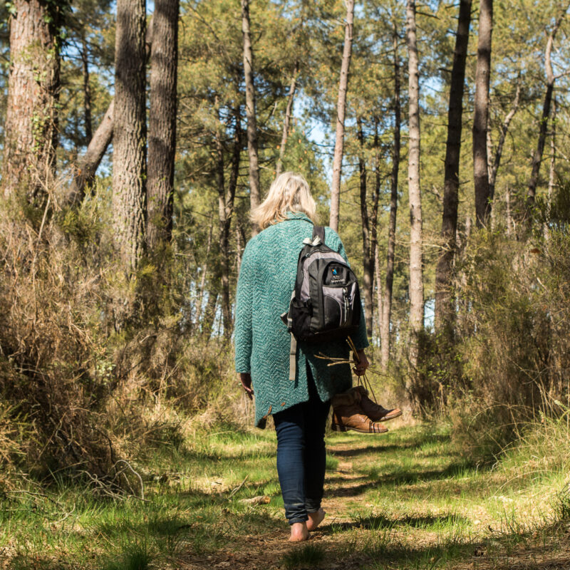 La balade se poursuit, sans chaussures. « La voute plantaire est dotée de milliers de terminaisons nerveuses, marcher pieds nus détend, relance la circulation sanguine, fait ralentir, rend attentifs » les aiguilles de pins sont finalement moins redoutables mais la petite branche de genêt tombée au sol, elle, restera mémorable.