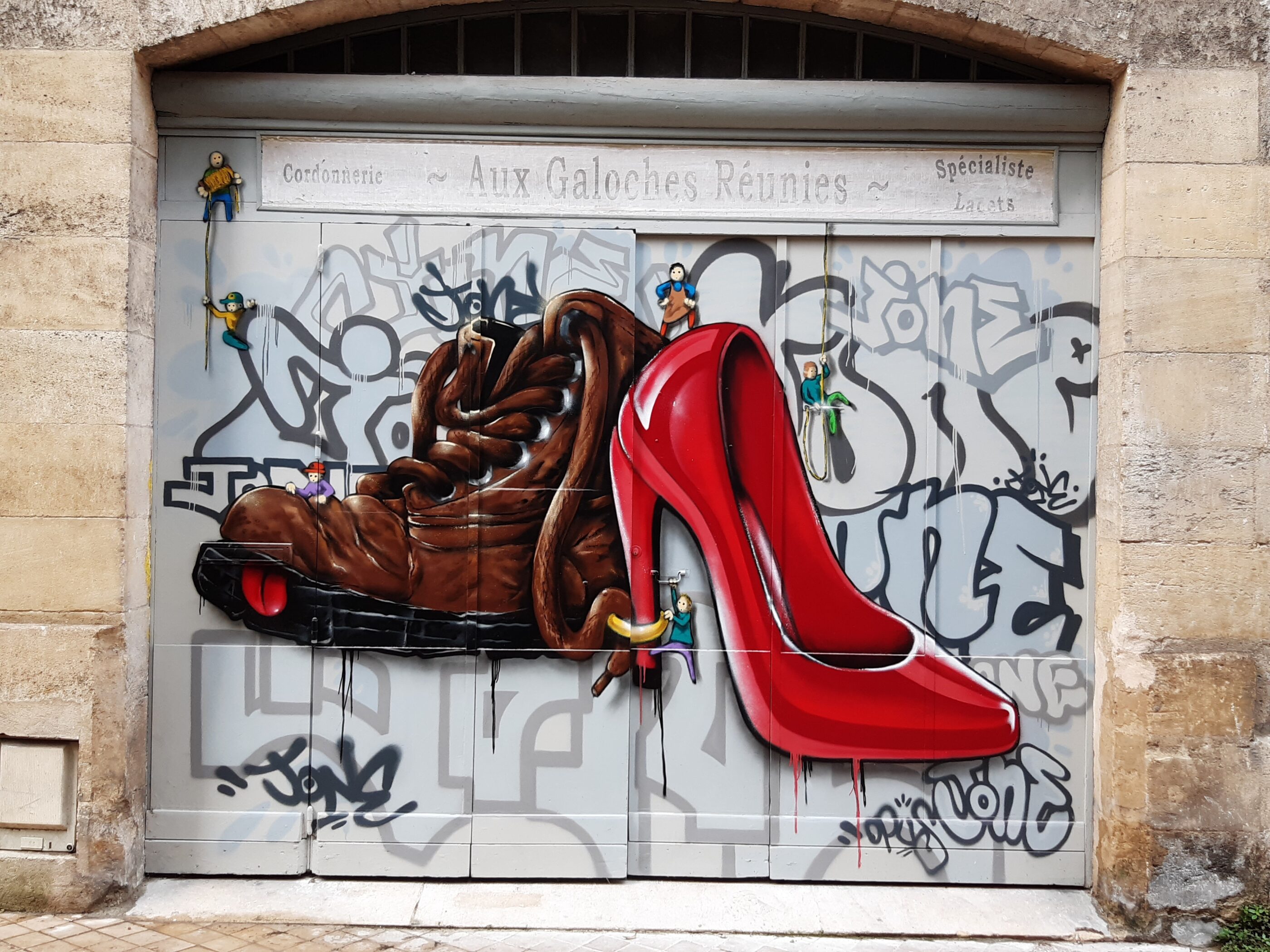 À ces anciens édifices dédiés au négoce – parmi lesquels la maison familiale de Montaigne – se mêlent une dizaine de fresques, rythmant les arcades de la rue.