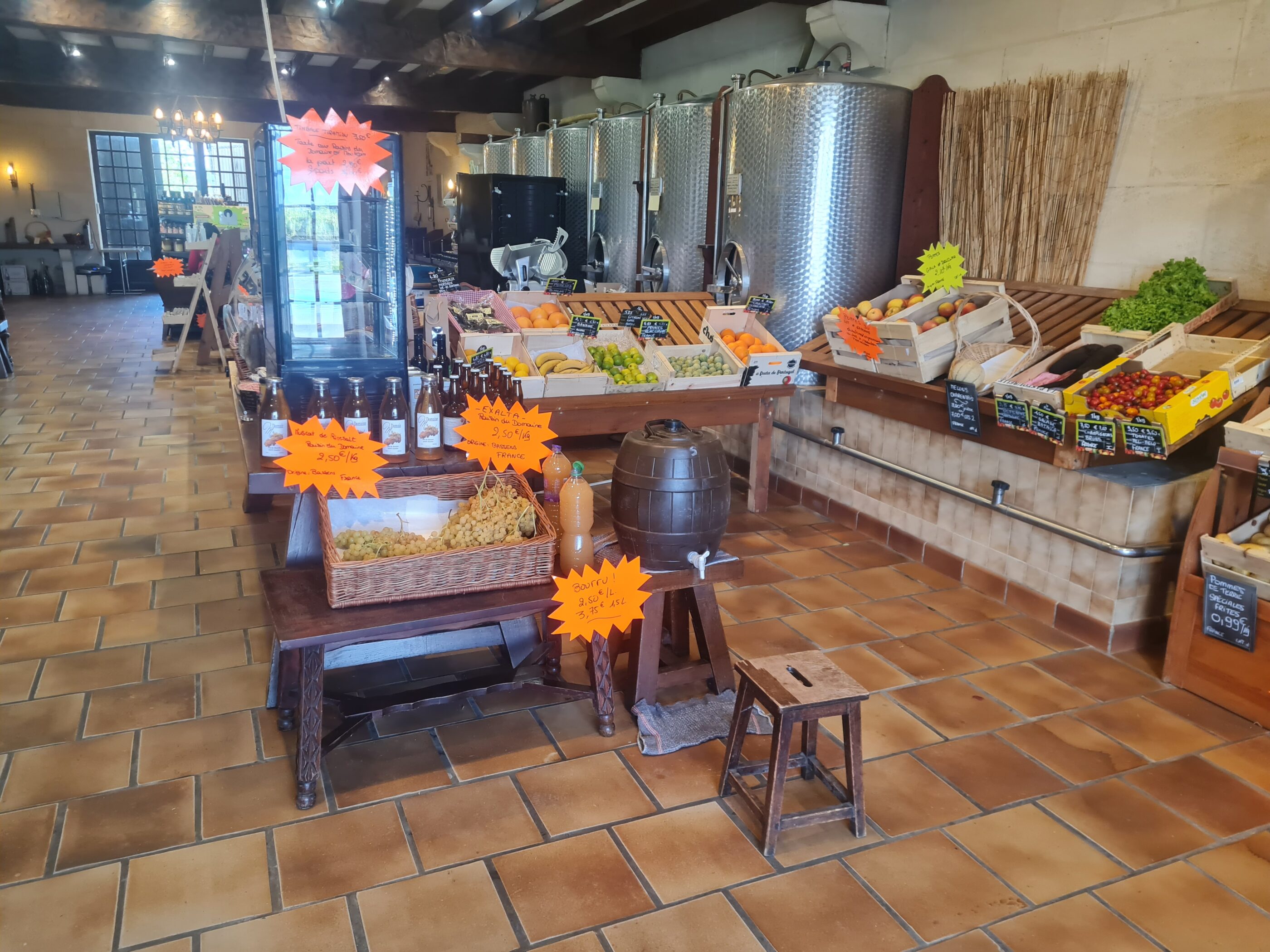 © Pierre Zenker Derrière sa devanture discrète, cette boutique familiale cache bien des trésors. Depuis 60 ans, on y cultive l’art de recevoir et de partager, dans une ambiance simple et chaleureuse, aux bords des vignes du domaine de Moulerin. À l’accueil, une propriétaire souriante guide les visiteurs entre cuves, épicerie fine et étals colorés de fruits et légumes bio.